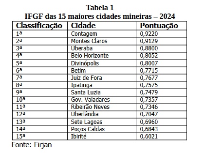A Firjan – Federação das Indústrias do Rio de Janeiro, patrocina e divulga anualmente um estudo sobre a situação financeira de 5.129 municípios brasileiros. Trata do IFGF – Índice Firjan de Gestão Fiscal. Pois bem, acaba de ser publicado o IFGF de 2024, e Contagem, com Marília, é o primeiro lugar dentre as 15 maiores cidades mineiras. A pontuação varia de 0 a 1. Contagem ficou com 0,9220, e recebeu a avaliação máxima de “Gestão de Excelência”. Veja a tabela 1.(…) A leitura dos resultados do IFGF é bastante simples: a pontuação varia entre 0 e 1, sendo que quanto mais próxima de 1 melhor a gestão fiscal do município. Com o objetivo de estabelecer valores de referência que facilitem a análise, foram convencionados quatro conceitos para o IFGF: a) Gestão Fiscal de Excelência: resultados entre 0,8 e 1,0 pontos; b) Boa Gestão Fiscal: resultados entre 0,6 e 0,8 pontos; c) Gestão Fiscal em Dificuldade: resultados entre 0,4 e 0,6 pontos; Gestão Fiscal Crítica: resultados entre 0,4 e 0,0 pontos.(…) Contagem, no governo Marília Campos, com IFGF de 0,9220, é considerada “Gestão Fiscal de Excelência” e, dentre as 15 maiores cidades de Minas, só conseguiram nota máxima Contagem, Montes Claros, Uberaba, Belo Horizonte e Divinópolis.