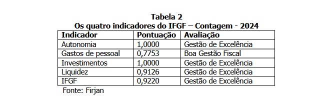 Contagem segundo os quatro indicadores do IFGF: autonomia, gastos de pessoal, investimentos e liquidez. O IFGF é composto por quatro indicadores, que assumem o mesmo peso para o cálculo do índice geral, 25%: a) Autonomia: verifica se as receitas oriundas da atividade econômica do município suprem as despesas essenciais para o funcionamento da máquina pública local; b) Gastos de Pessoal: mostra o quanto os municípios gastam com o pagamento de pessoal em relação ao total da Receita Corrente Líquida; c) Investimentos: mostra a parcela da Receita Total dos municípios destinada aos investimentos, que é a capacidade de gerar bem-estar e competitividade; d) Liquidez: aponta a relação entre o total de restos a pagar acumulados no ano e os recursos em caixa disponíveis para cobri-los no ano seguinte. Veja a tabela 2, com os indicadores do IFGF de Contagem de 2024.