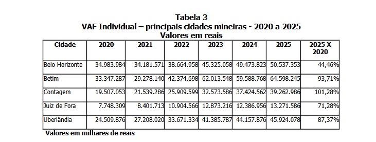 Veja o papel multiplicador dos investimentos no governo Marília Campos de 2021 a 2024. Investimentos feitos com recursos do Tesouro Municipal, sobretudo com empréstimos que não são aplicados para quitar dívidas, mas que são revertidos na sua totalidade em obras em toda a cidade e com recursos dos governos federal e estadual, de empresas privadas e de outras fontes. Não temos ainda os dados do PIB municipal mais recentes, os últimos divulgados foram os de 2021, para confirmar o desenvolvimento de Contagem mais acelerado que em outros municípios. O IBGE promete para este ano o PIB municipal de 2022 e 2023 e o PIB municipal anual desde 2002 com novas metodologias. Mas veja só alguns dados importantes da pujança da economia de Contagem: a) O VAF – Valor Adicionado Fiscal de Contagem passou de R$ 19,507 bilhões, em 2020, para R$ 39,262 bilhões em 2025, um avanço nominal de 101,28% muito superior ao de outras grandes cidades de Minas Gerais, como pode ser visto na tabela 3; b) Contagem no PIB é a terceira economia de Minas Gerais, mas na geração de empregos é segunda colocada no Estado; de 2021 a 2024 foram 32.718 empregos contra 27.457 de Uberlândia e 23.465 de Betim; Contagem tem um estoque de empregos formais de carteira assinada de 230.539 trabalhadores, praticamente o mesmo número de Uberlândia de 235.824.