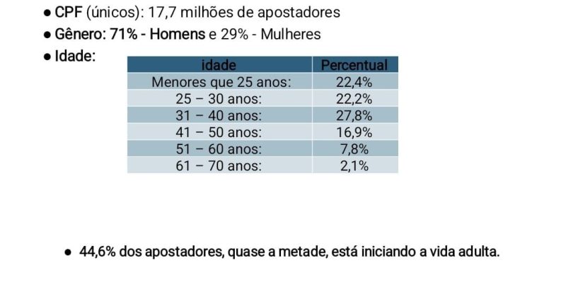 O perfil dos apostadores indica que 71% são homens, sendo a maioria entre 18 e 30 anos (dados no anexo abaixo) — ou seja, 41% estão iniciando a vida adulta.